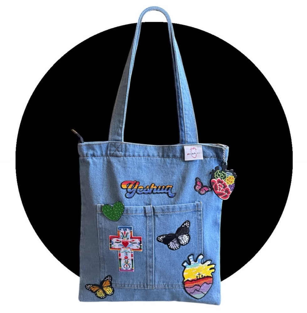 *Denim tote *Measures 15x13, zipper closure, one interior pocket *"De Colores" key chain included *"You Complete Me" enamel pin included *Sticker included